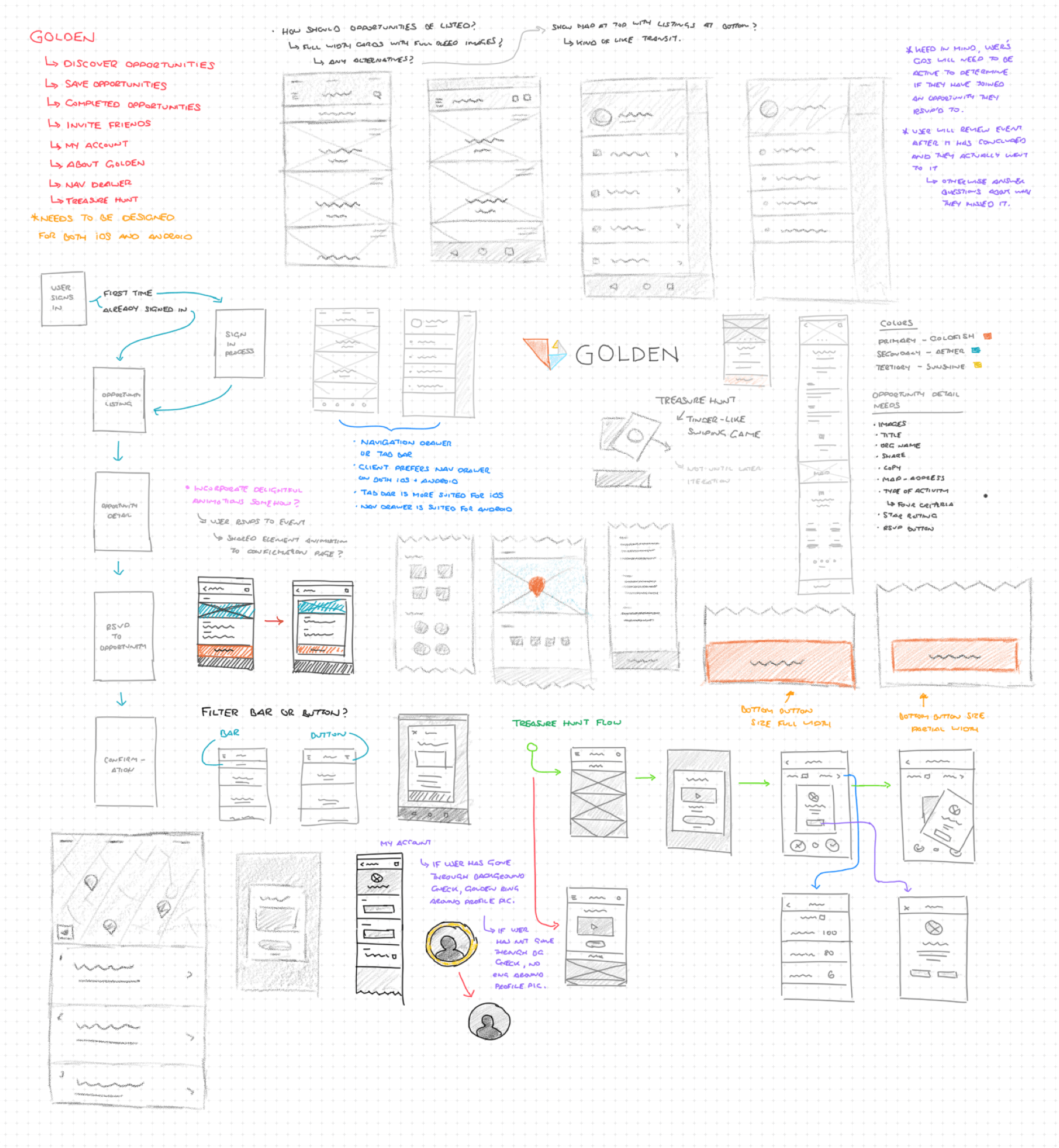 Working with the founder to understand his overall goals and long-term vision for the Golden app, I began sketching out ideas for workflow, style, information architecture, and interactions.