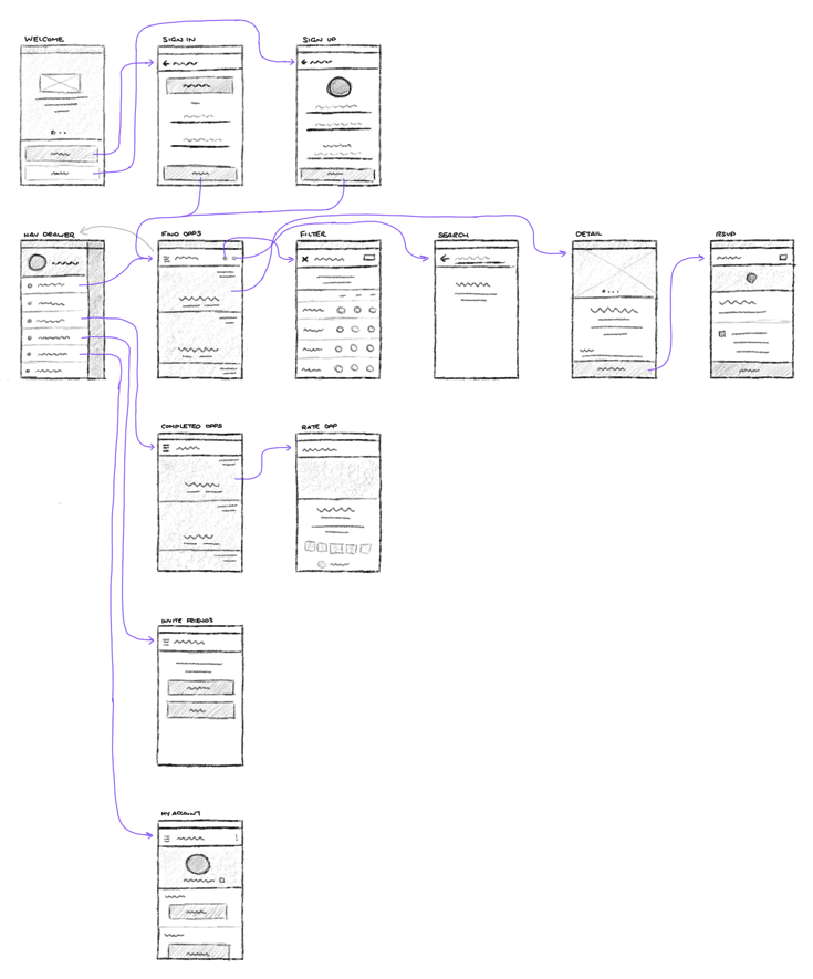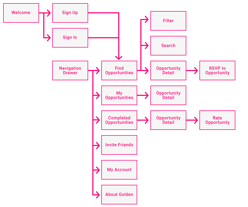 Based on the ideation and with feedback from the founder, I then began working on the overall user flow mapping, determining how the user would work with the app to find volunteering opportunities, rsvp to them, and rate them when completed.