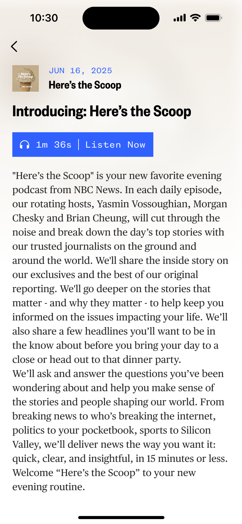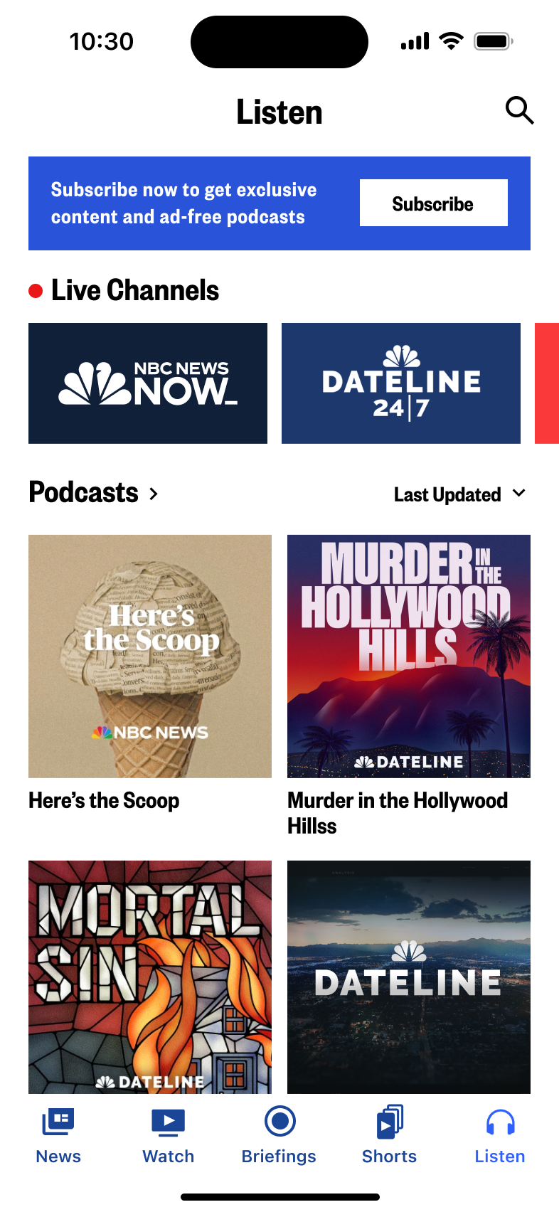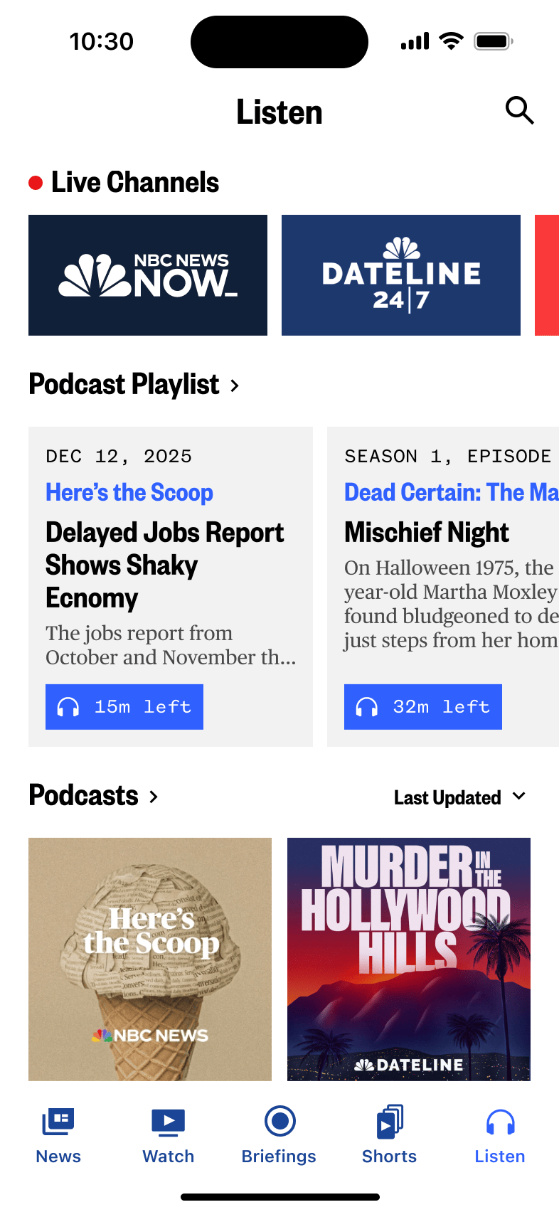 The listen tab has been updated to not only serve as the home to find live audio streams of NBC News Now, Dateline, and Today, but will also serve as the hub in which users can discover and play NBC News podcasts, which is a net new addition to the app.