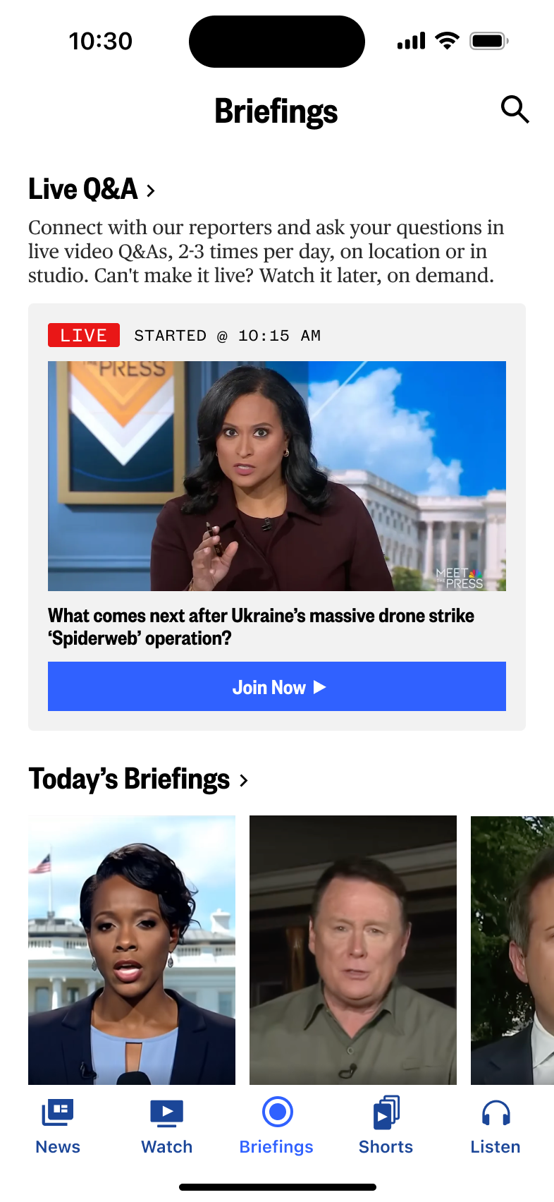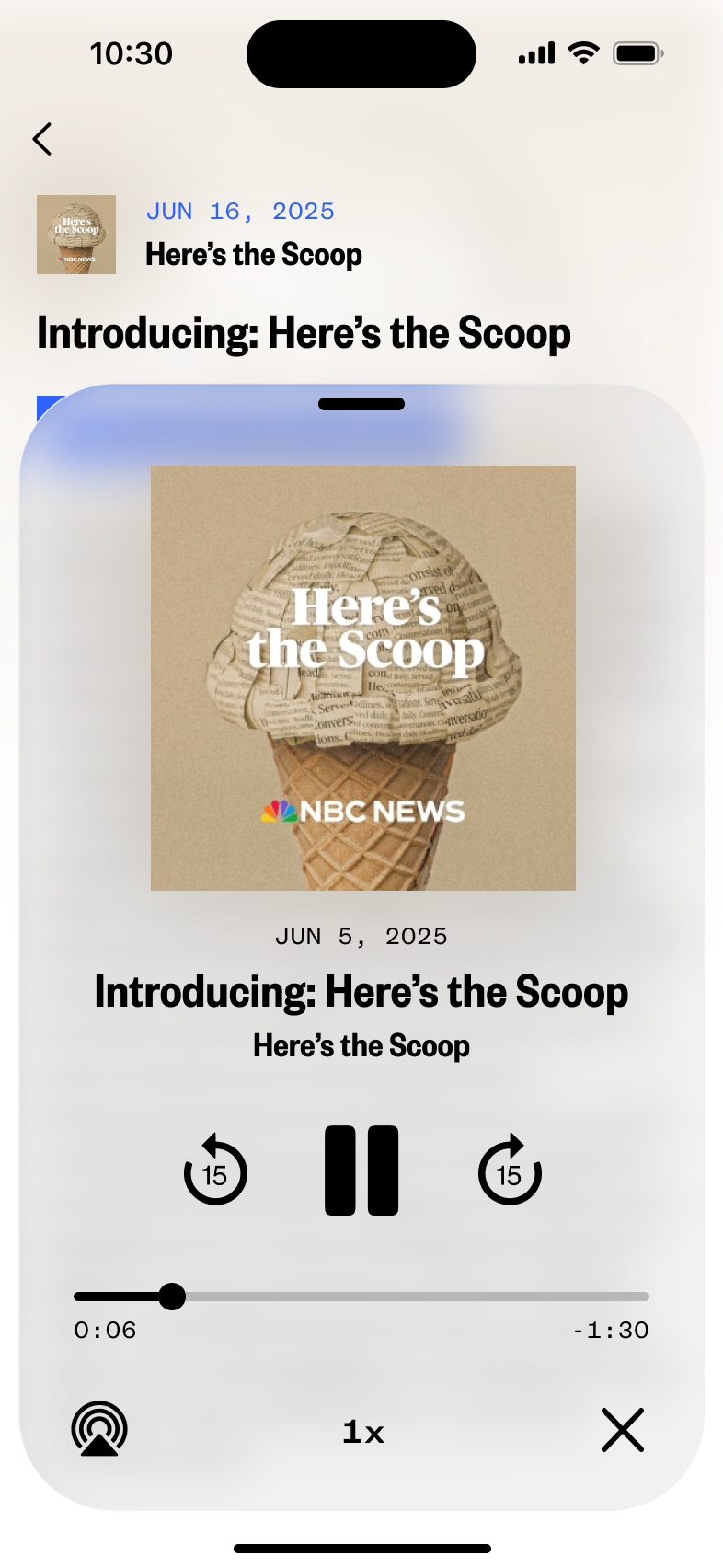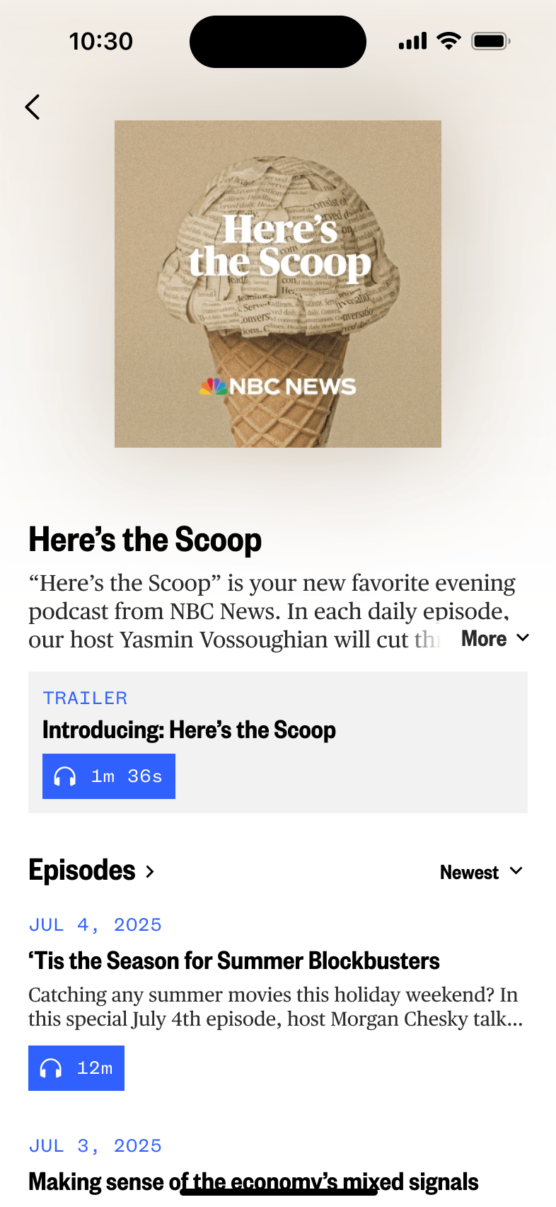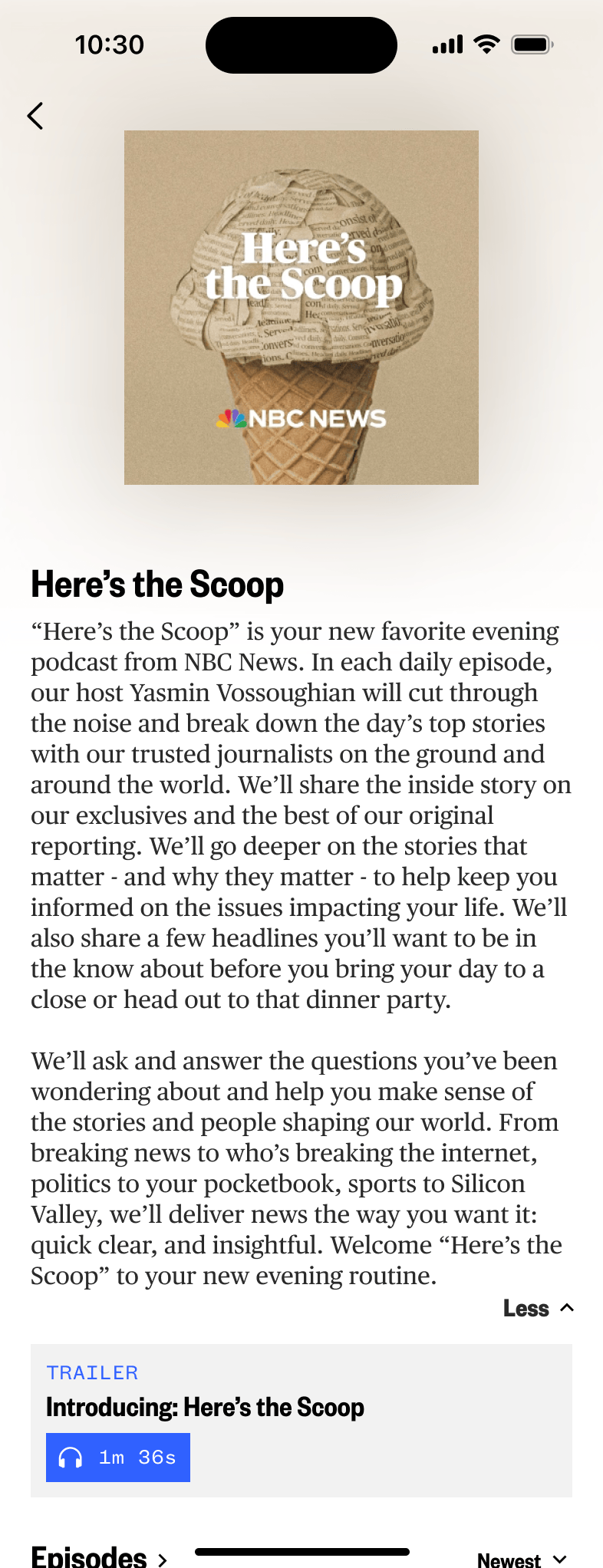 The listen tab has been updated to not only serve as the home to find live audio streams of NBC News Now, Dateline, and Today, but will also serve as the hub in which users can discover and play NBC News podcasts, which is a net new addition to the app.