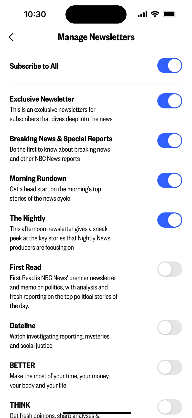 In February 2024 it was announced that NBC News would deliver a new subscription product to users by the end of the year. While the subscription would be available to users on both web and apps. a heavier emphasis on apps was placed where new features and content types would be added to ensure we were delivering value to users.