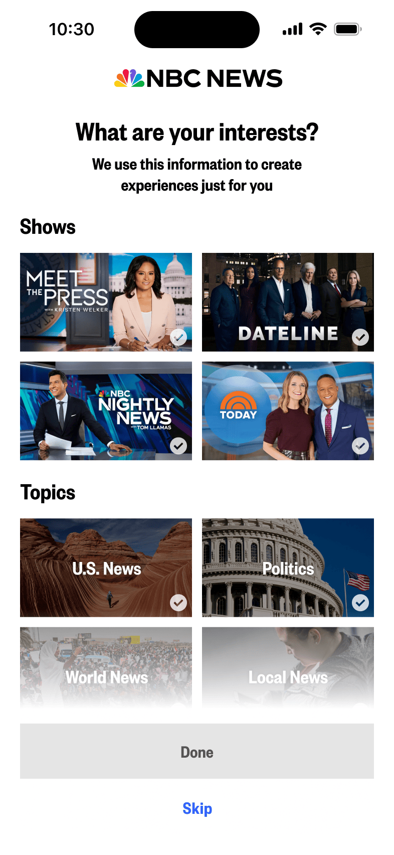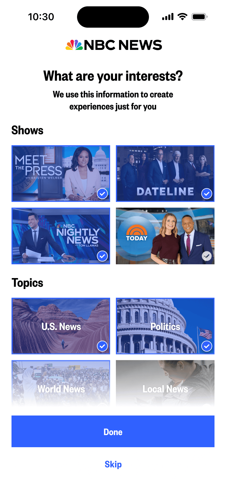 As a part of the process to onboard a user into the new NBC News subscription, we wanted users to select their interests in terms of shows and topics they want to keep up with.